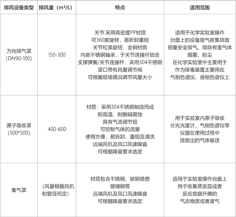 排風(fēng)系統(tǒng)常與末端集氣罩,原子吸收罩、萬(wàn)向排氣罩,其特性對(duì)比見(jiàn)下表