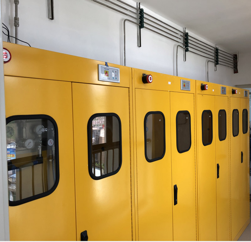 用于提高局部的排氣通風(fēng),保護(hù)鋼瓶(氣瓶)不受柜子外面火災(zāi)以及保護(hù)周圍物免受內(nèi)部火災(zāi)的金屬容器。氣瓶柜內(nèi)部有吹洗系統(tǒng),報(bào)警器和排氣孔,通常有一瓶位、二瓶位和三瓶位。